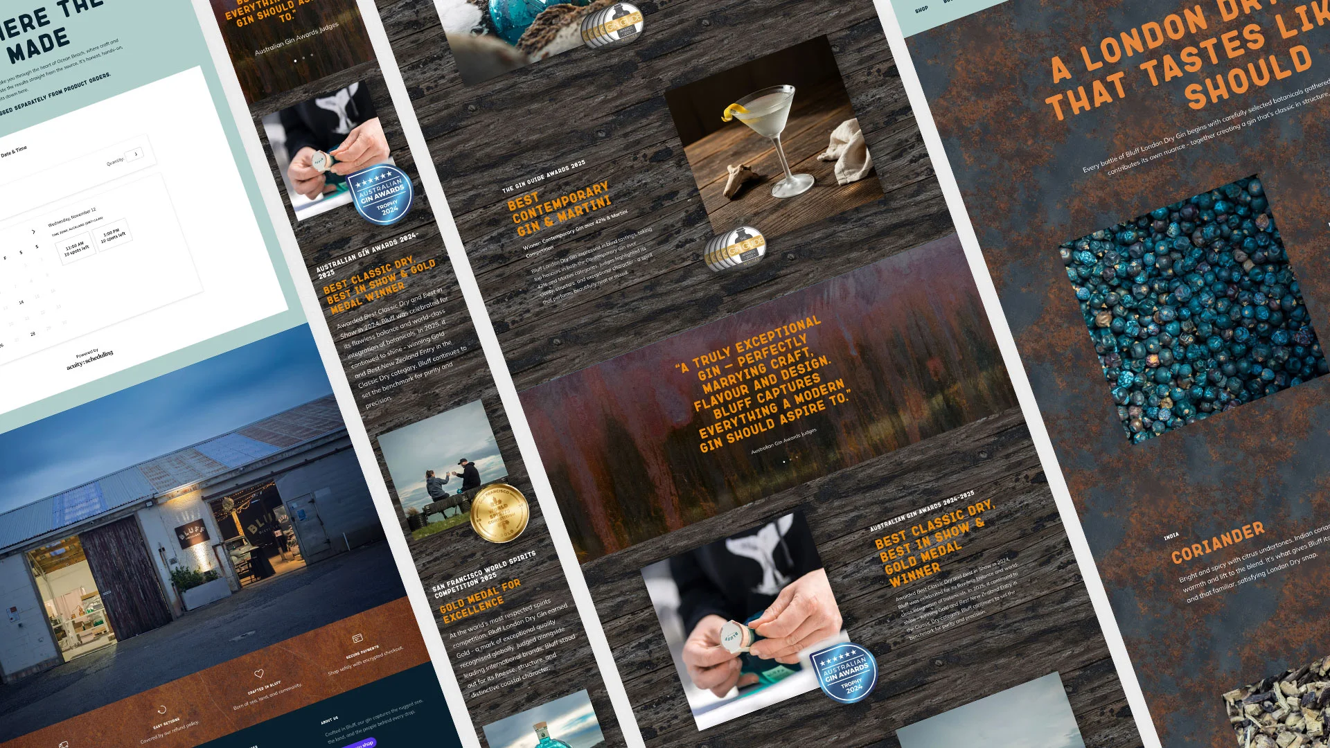 Vivid Studio designed and developed a bespoke Shopify e-commerce website for Bluff Distillery -- combining a premium visual identity with fully custom front-end development. Every element, from layout and navigation to interactive components, was crafted to reflect the brand's artisanal character while delivering a high-performing, conversion-optimised online store.