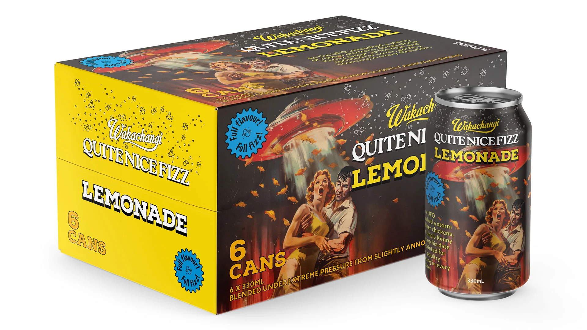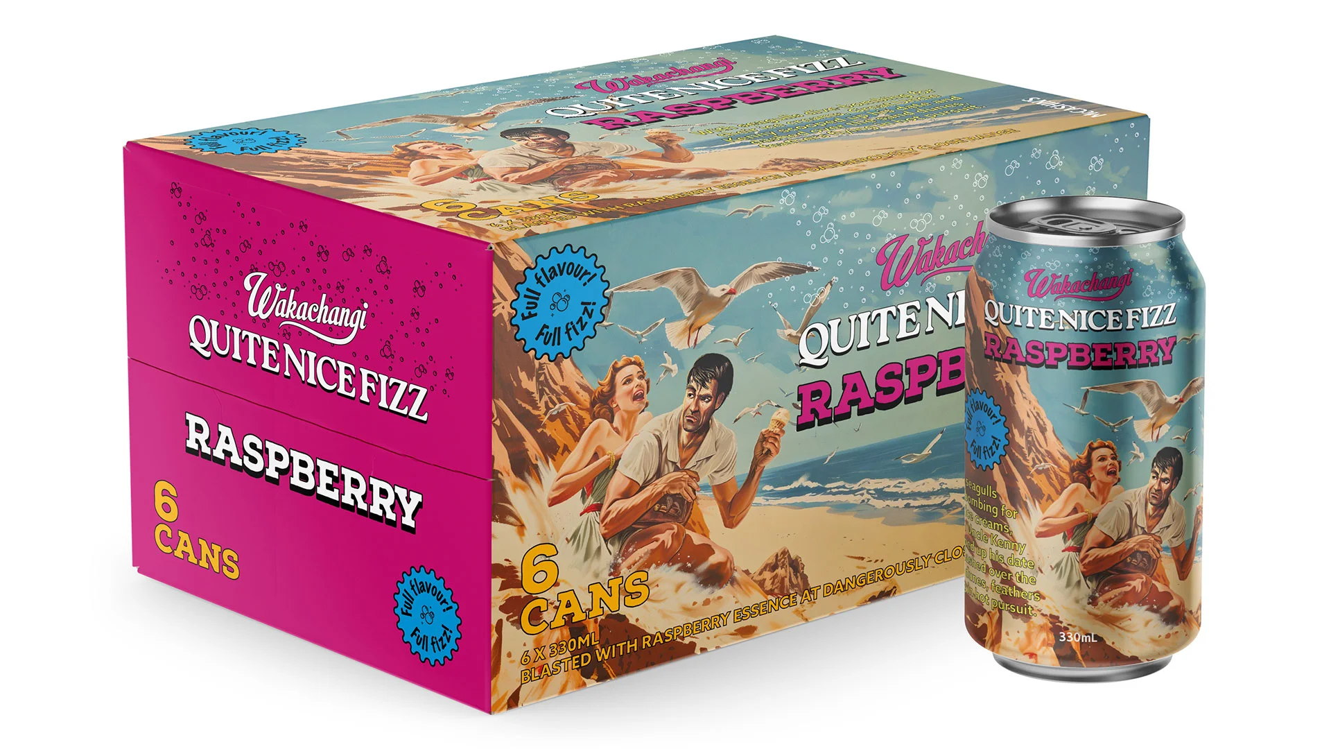 Vivid Studio led brand and packaging design for Quite Nice Fizz, a new sub-brand within the Wakachangi family. From early concept development through to final print-ready packaging artwork, the studio handled ideation, visual direction, copywriting, and detailed artwork across multiple formats -- launching the brand with a distinctive, irreverent look true to the Wakachangi personality.